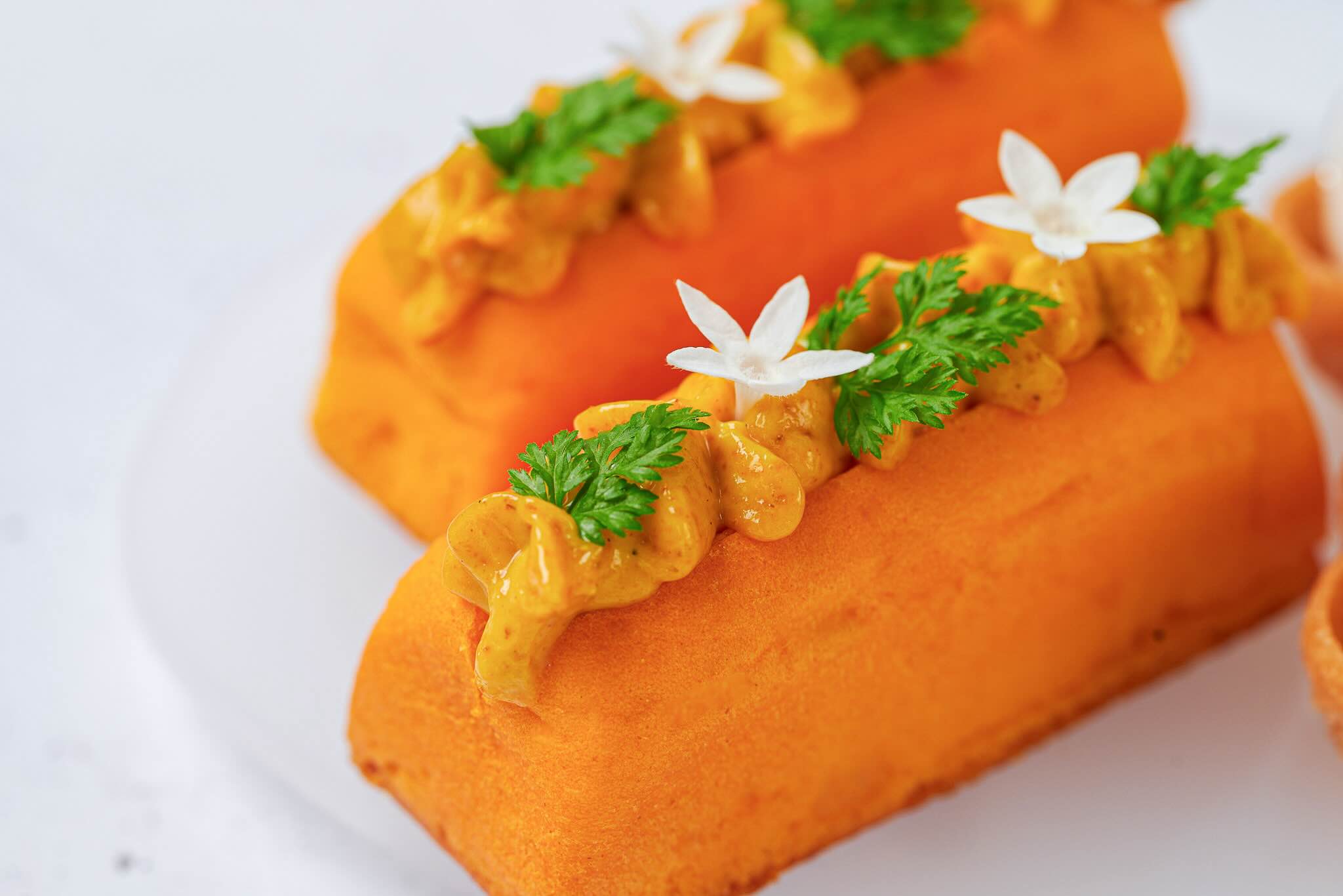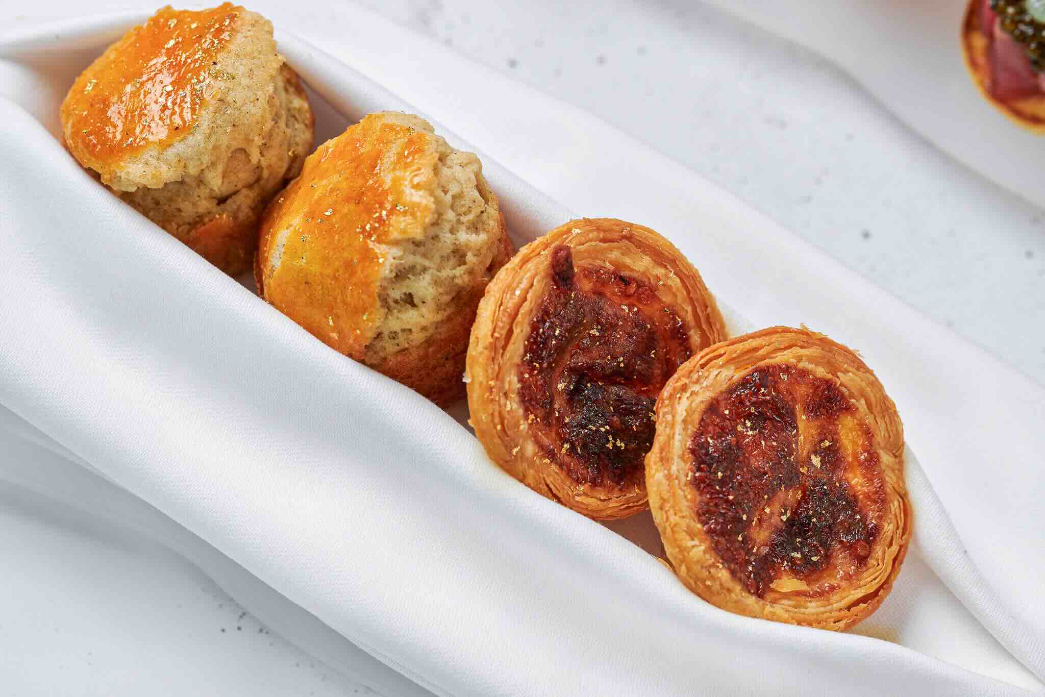 Blue Fin Tuna, Ponzu, and Caviar put the focus once again on the produce available at SKAI, featuring blue fin tuna topped with N25 Caviar, which Chef appreciates for its texture and flavour profile. It is served with crème fraîche and garnished with gold leaf and blue flowers. The Coronation Smoked Chicken, Mango Chutney & Coriander comprises a yellow saffron coffin bun stuffed with smoked chicken, classic coronation sauce, house-made mango chutney, and garnished with chervil and pentas flowers. For the final savoury offering, expect a delicious Brie Cheese Quiche.