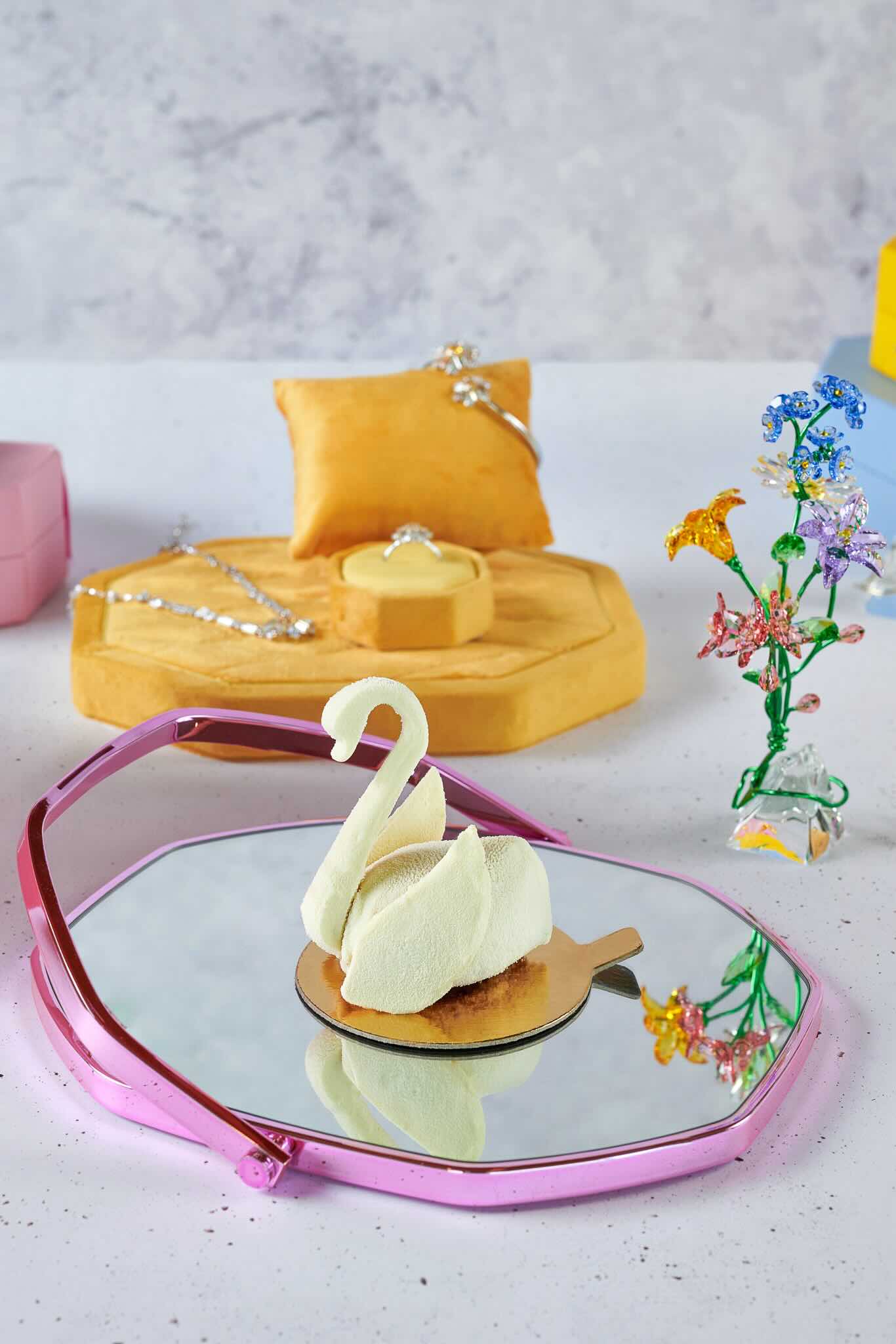 The desserts are equally exquisite works of art, drawing inspiration from Swarovski’s brand icon, shapes, and colors. The Hazelnut Praline Yuzu Vanilla Swan Choux is a beautifully handcrafted piece, presented to resemble the brand’s distinct elegant swan. The choux is filled with a delicate balance of hazelnut praline and yuzu. With the Golden Raspberry Rose Mascarpone Octagon Sable, Chef Ming presents fresh raspberries with rose mascarpone cheese atop a fruit tartlet, finished with a pink diamond-shaped jelly.