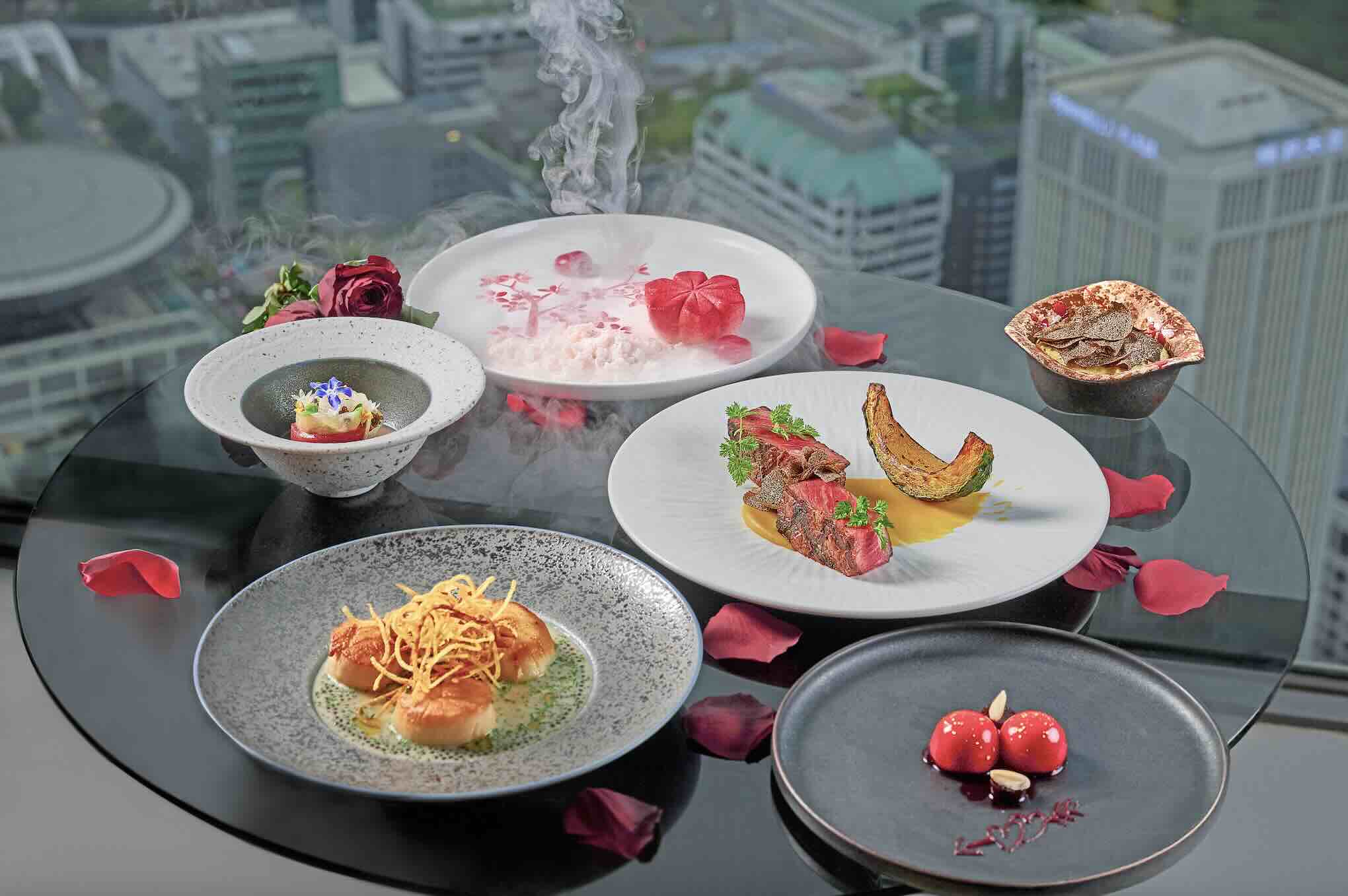 For a more laid-back yet sophisticated evening, SKAI Bar presents a curated Valentine’s menu featuring a bar-top buffet selection of Bluefin Tuna Cone, Chicken Liver and Foie Gras Parfait Tartlet, and Smoked Salmon. The mains offer a choice between Hokkaido Scallops or Wylarah Wagyu Sirloin, while dessert highlights include Rose Lychee Tart and Hazelnut Raspberry Gâteau.