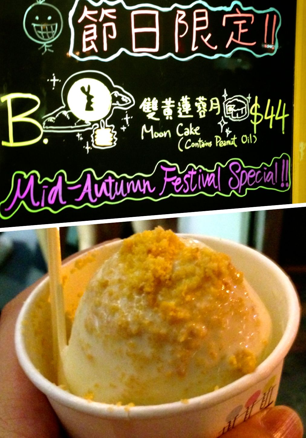 Feeling somewhat disappointed, we decided to grab some unique flavoured ice-cream from Lab-Made just down the road. They had the double egg-yolk mooncake flavour so I decided to give it a try even though I was skeptical about it. It was sweet and savoury at the same time, tasted just like the actual mooncake! Yummy!