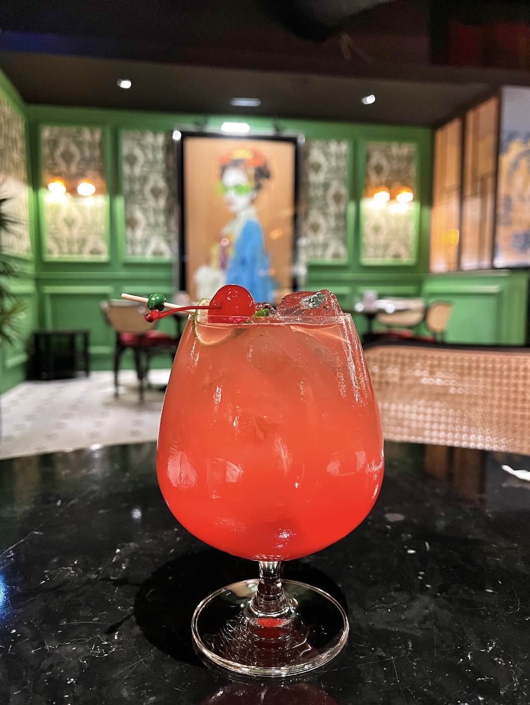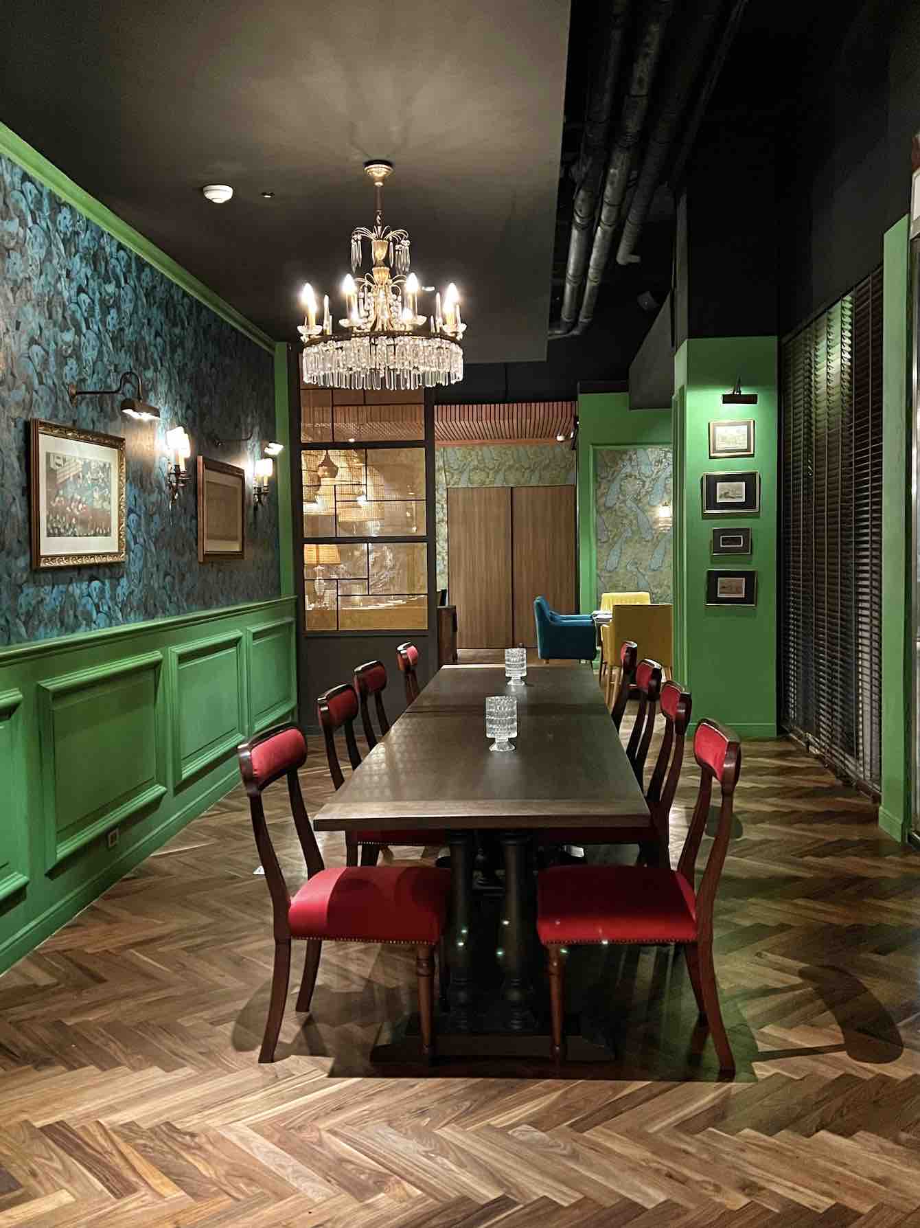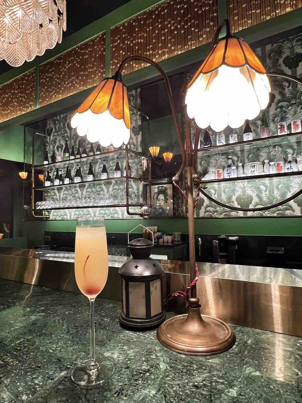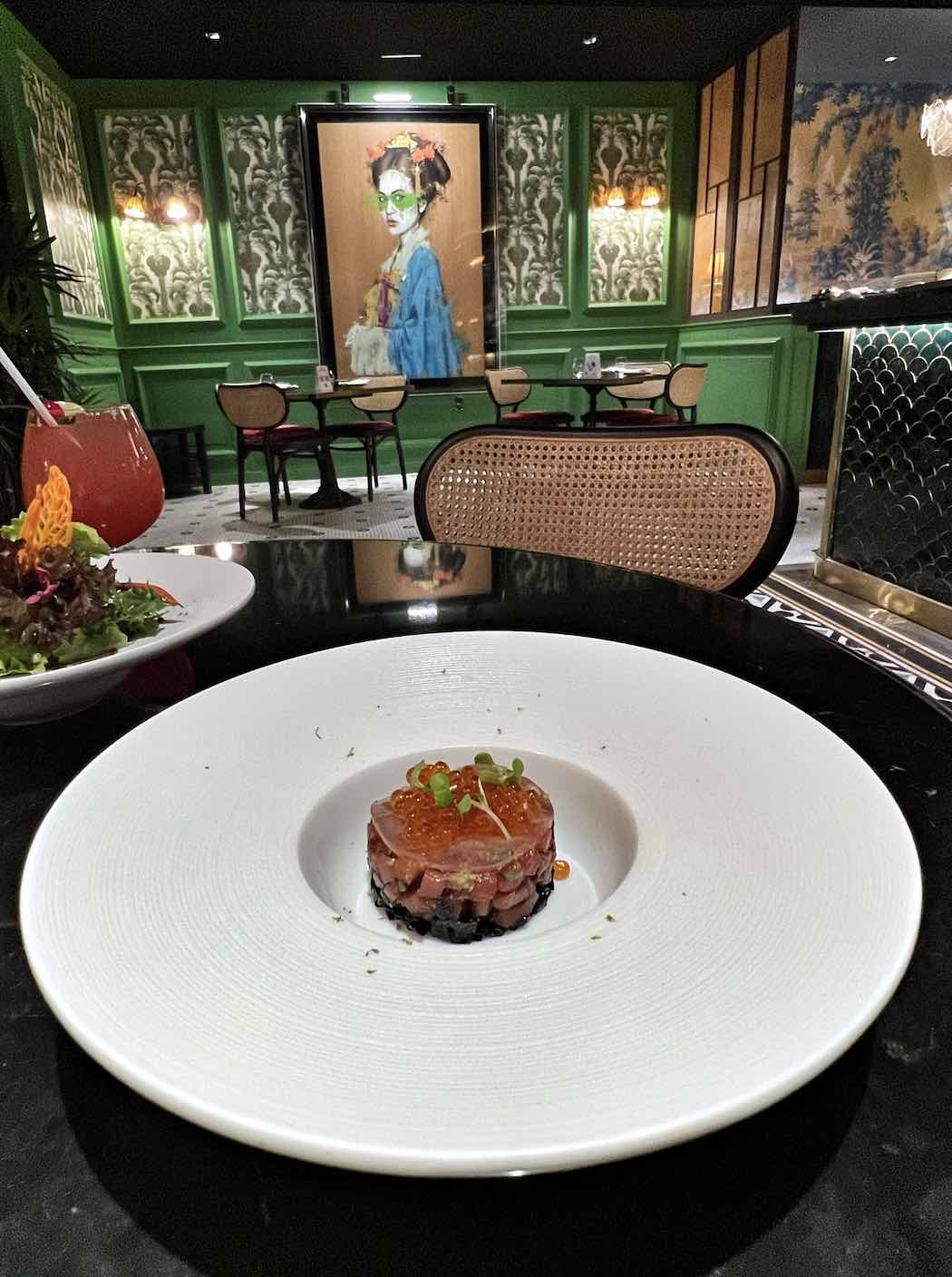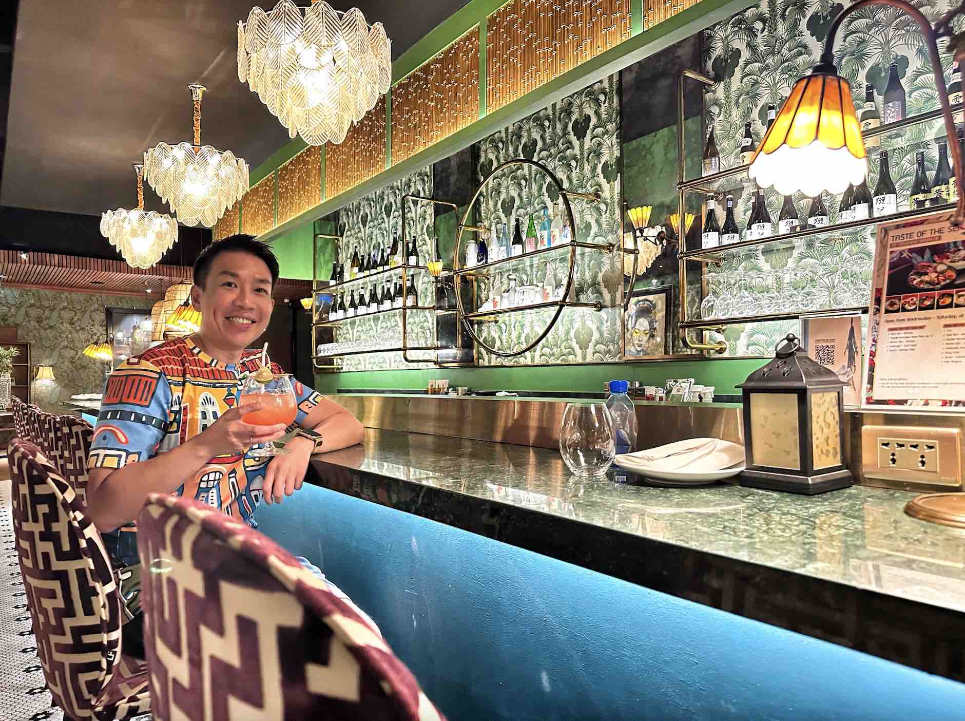 The bar area features curved booths and bistro-style marbled tables. The bar, where we got to savour a pre-dinner drink, is made of green granite and clad with green tiles with brass detailing.