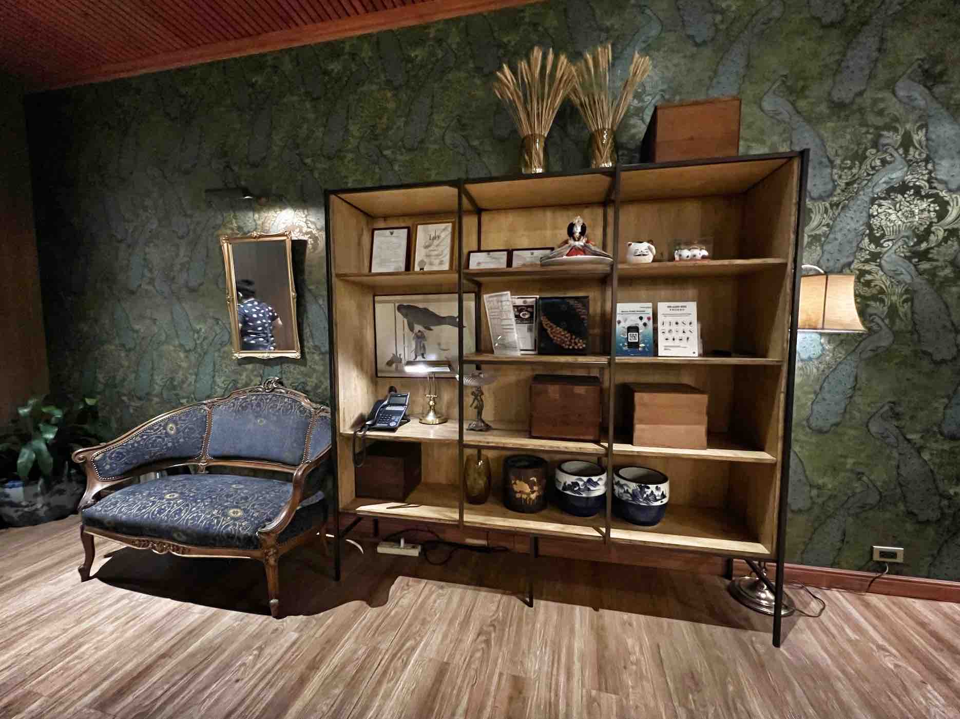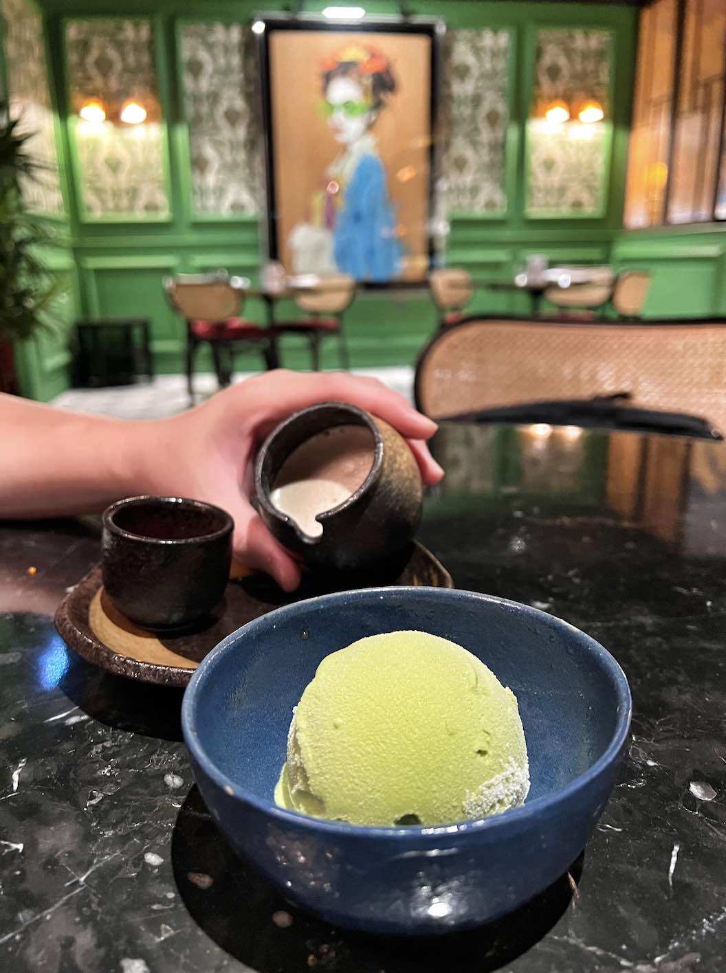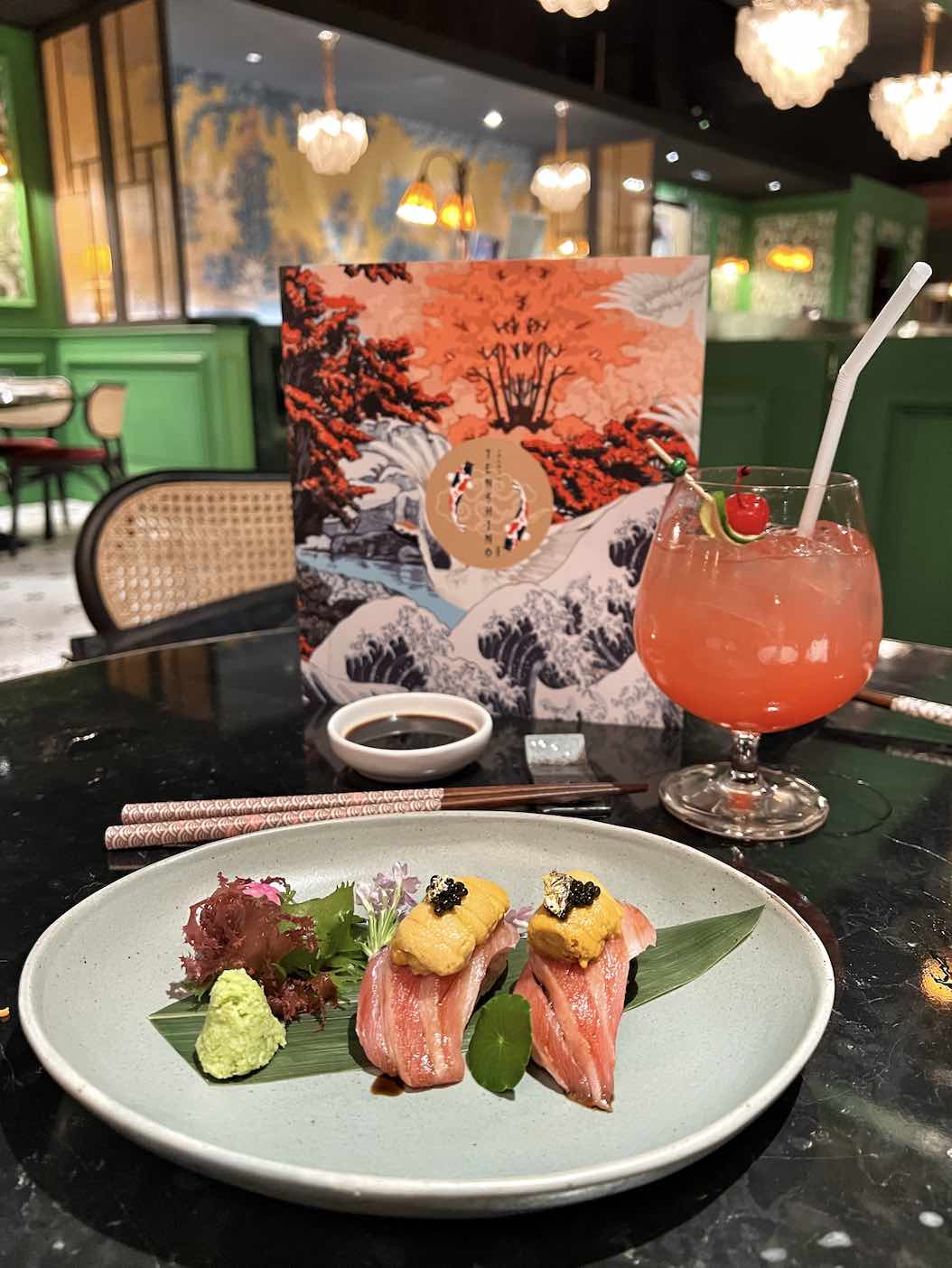 Behind the bar, we found a more intimate dining area, called The Dining Room. Semi-enclosed by woven rattan screens, it is designed for private dinners and features two 8-person teakwood tables that can be put together for larger groups. Wood panelling, velvet upholstery, crystal chandeliers and beautiful Japanese-inspired wallpaper lend The Dining Room sophistication and an air of luxury.