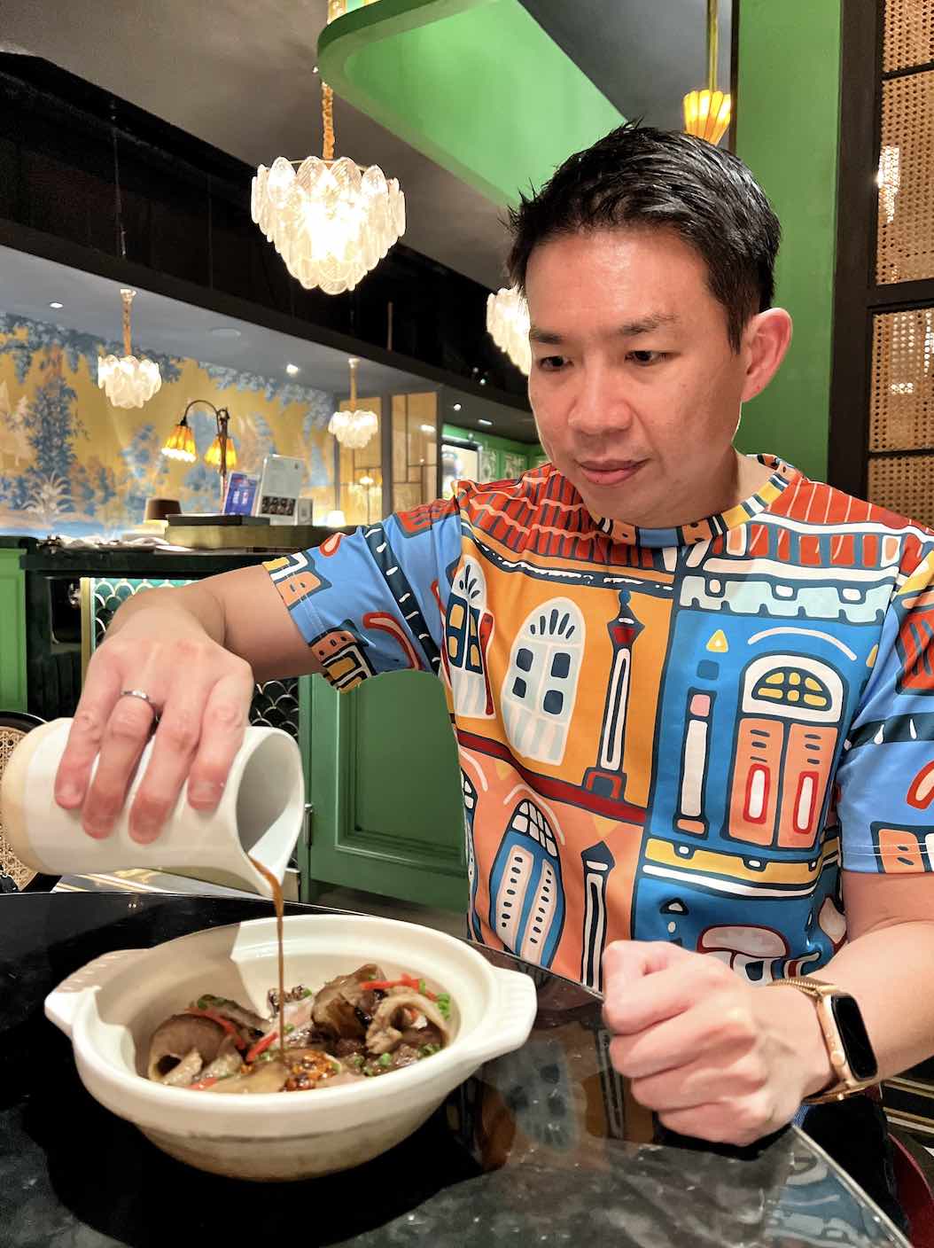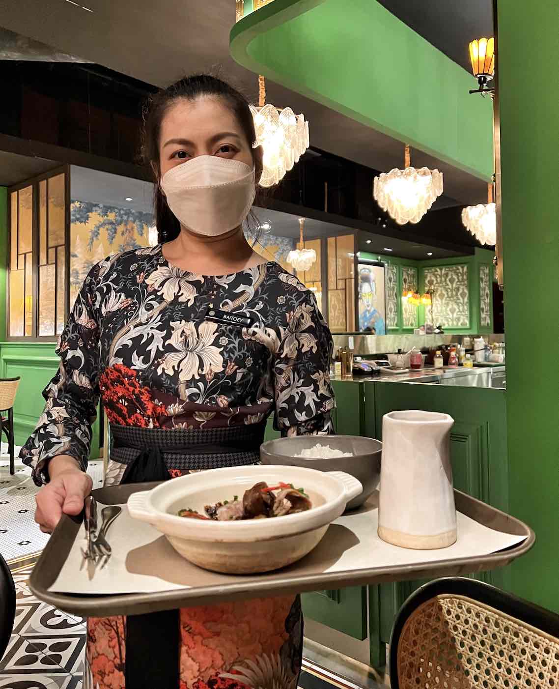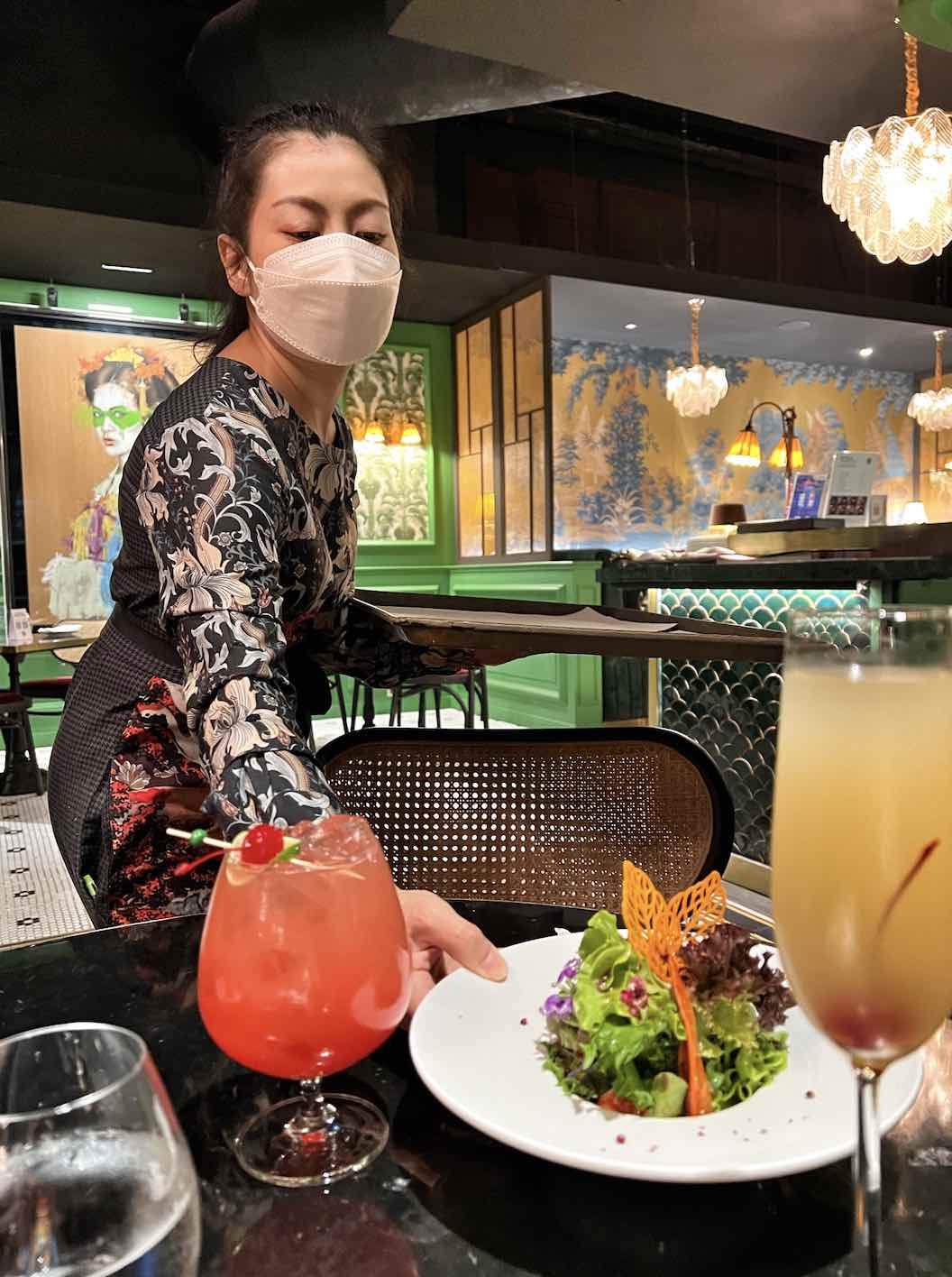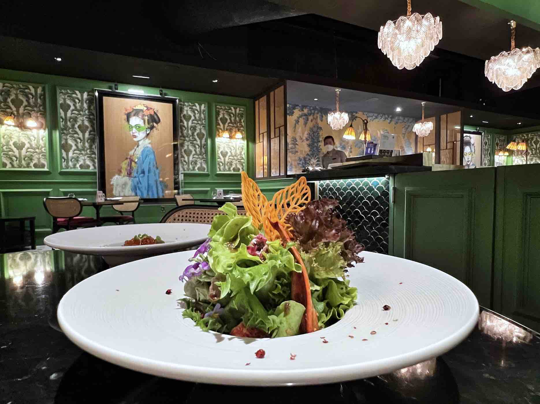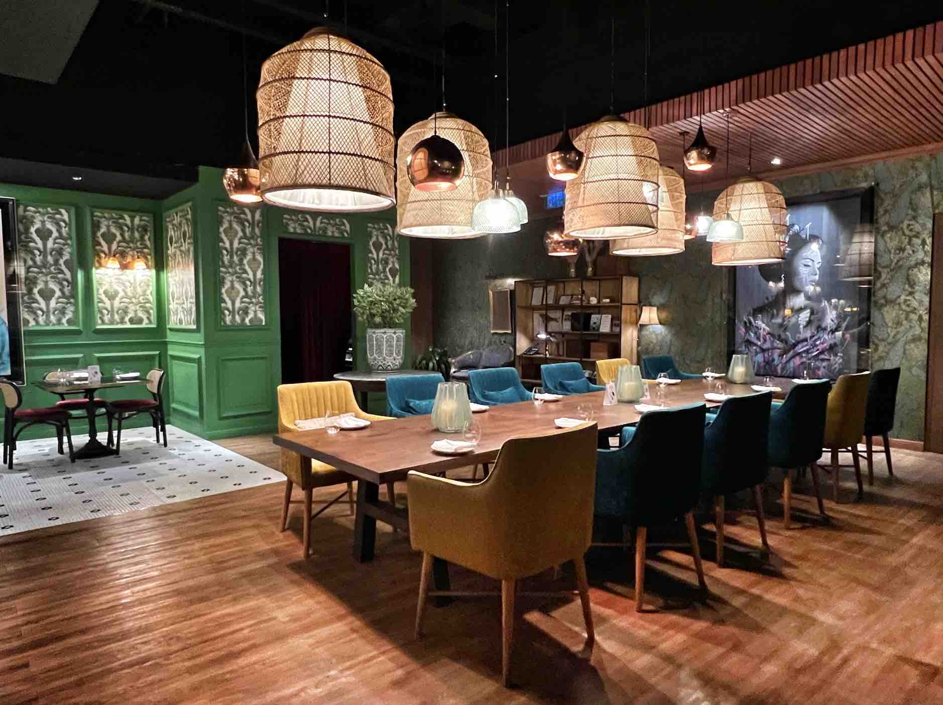 As soon as guests enter the restaurant, they are greeted by a 5-metre communal table set in a boldly appointed space decorated with glass, bamboo, copper touches and delicate wallpaper with a faded peacock print with gold embellishments.