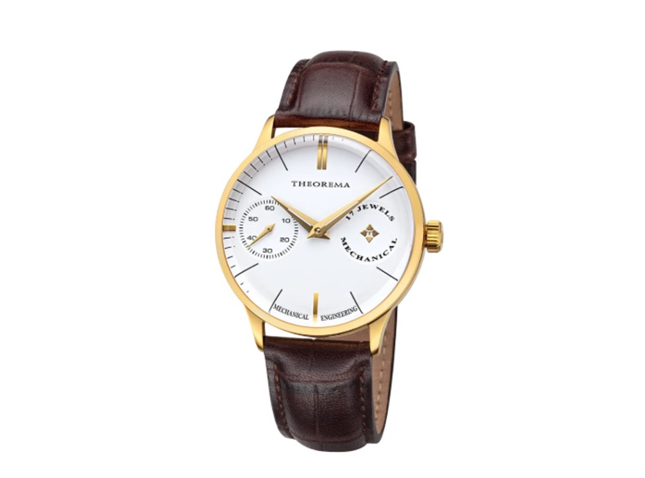 The Tufina Portofino offers a minimalist, elegant design that suits any classic outfit. Featuring dauphine hands, slim stick numerals, and a flat sub-dial for seconds, the design is refined without being overpowering. The gold case adds a luxurious touch, while the brown leather strap with a crocodile pattern enhances its charm. A fantastic mechanical dress watch at an affordable price of only $299.