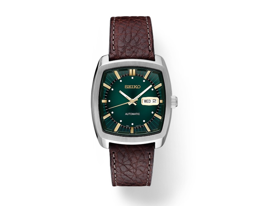 The Seiko Recraft collection is known for its unique designs, and the SNK P27 stands out with its green dial and rectangular case shape. Inspired by vintage 1970s timepieces, this watch comes with a 50-meter water resistance and an automatic movement. Although it lacks hand-winding functions and has a mineral crystal protecting the dial, it remains a stylish and solid option for only around $275.