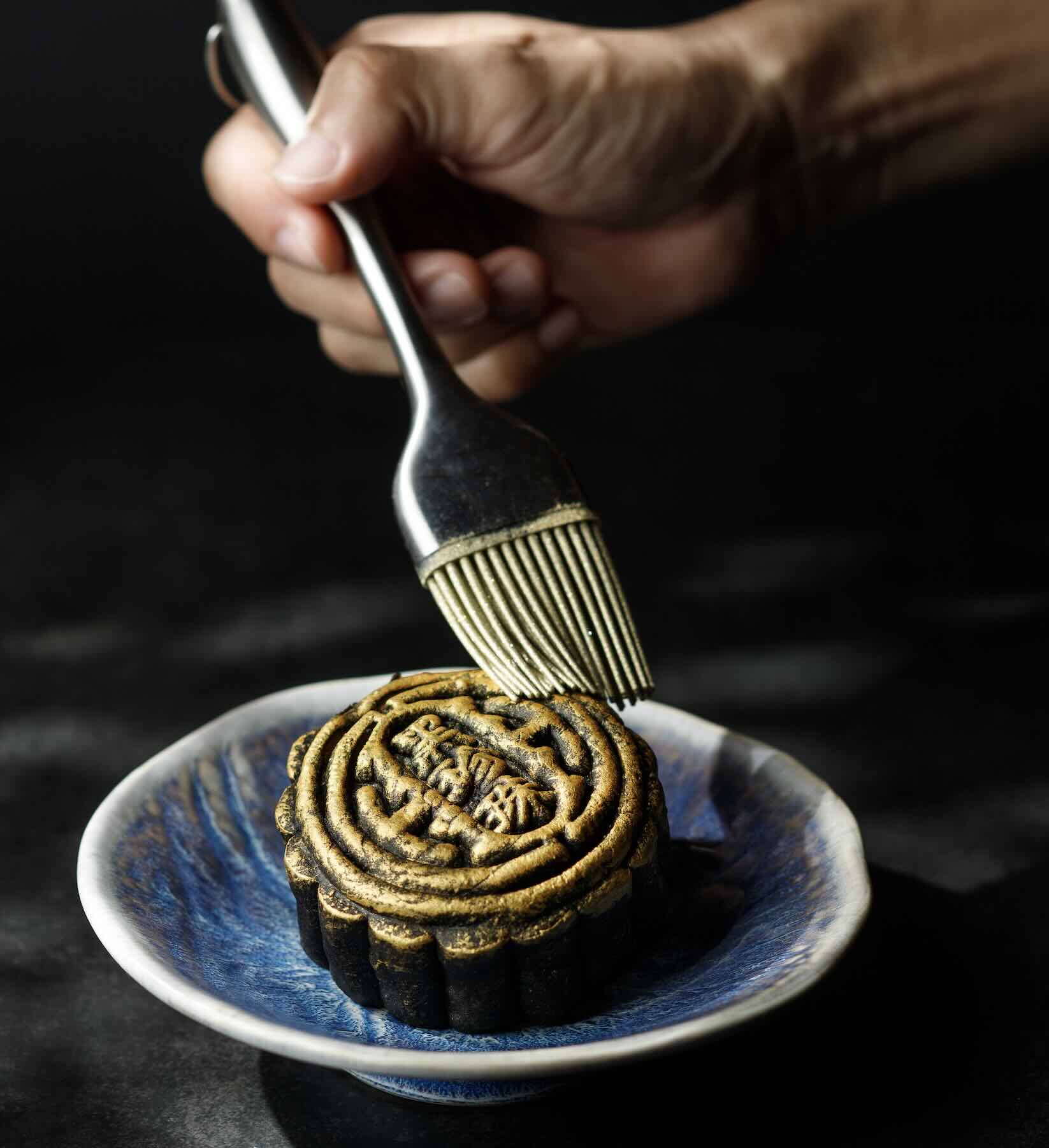 - Hong Kong Style Custard Mooncake (x2) — Gilded with gold and encased in a charcoal crust, this mooncake surprises with smooth custard and low-sugar white lotus paste.