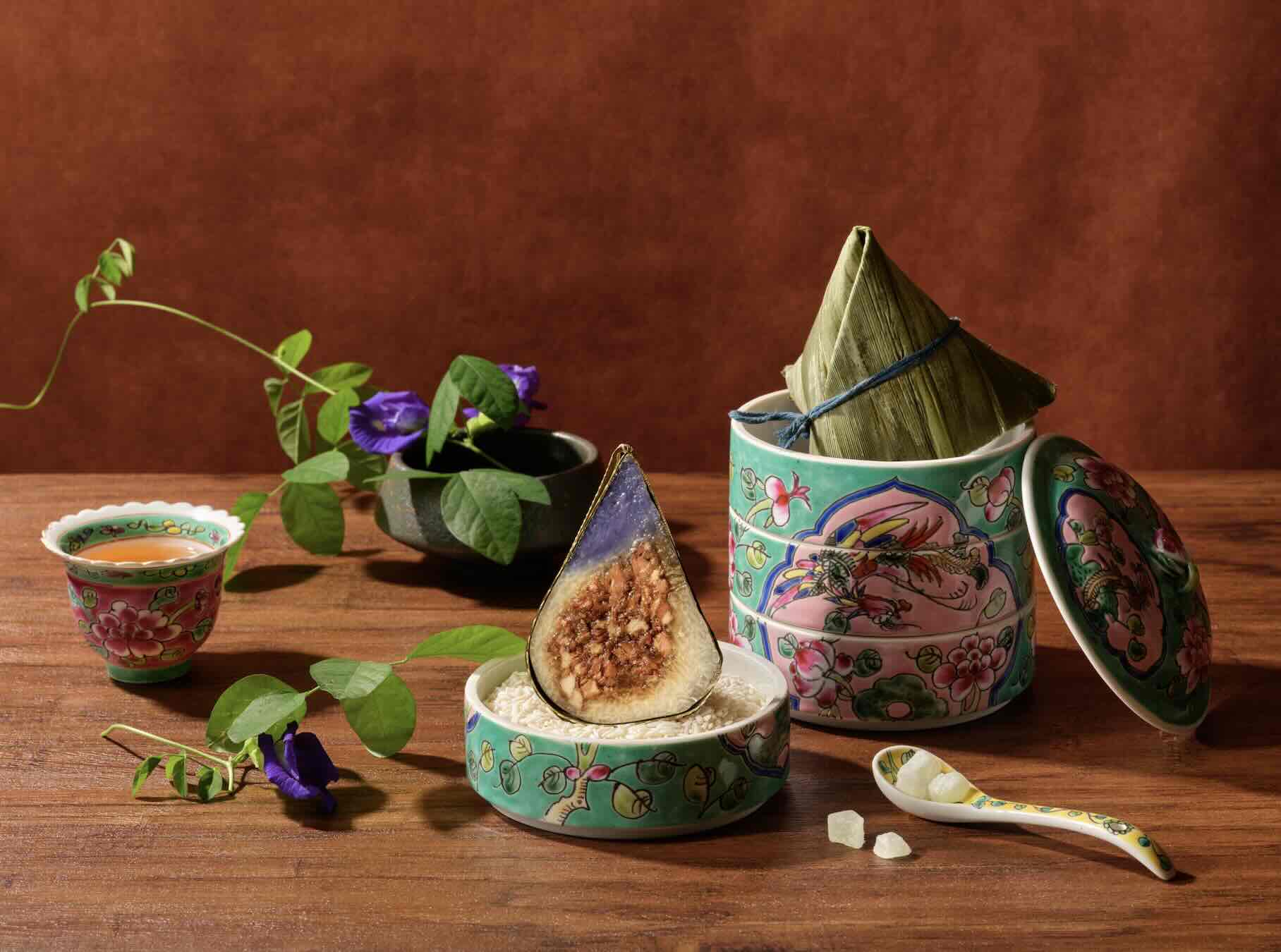 Nyonya Blue Pea Rice Dumpling (S$18 nett), filled with minced pork, mushrooms, and candied winter melon, inspired by Peranakan traditions and floral elegance.