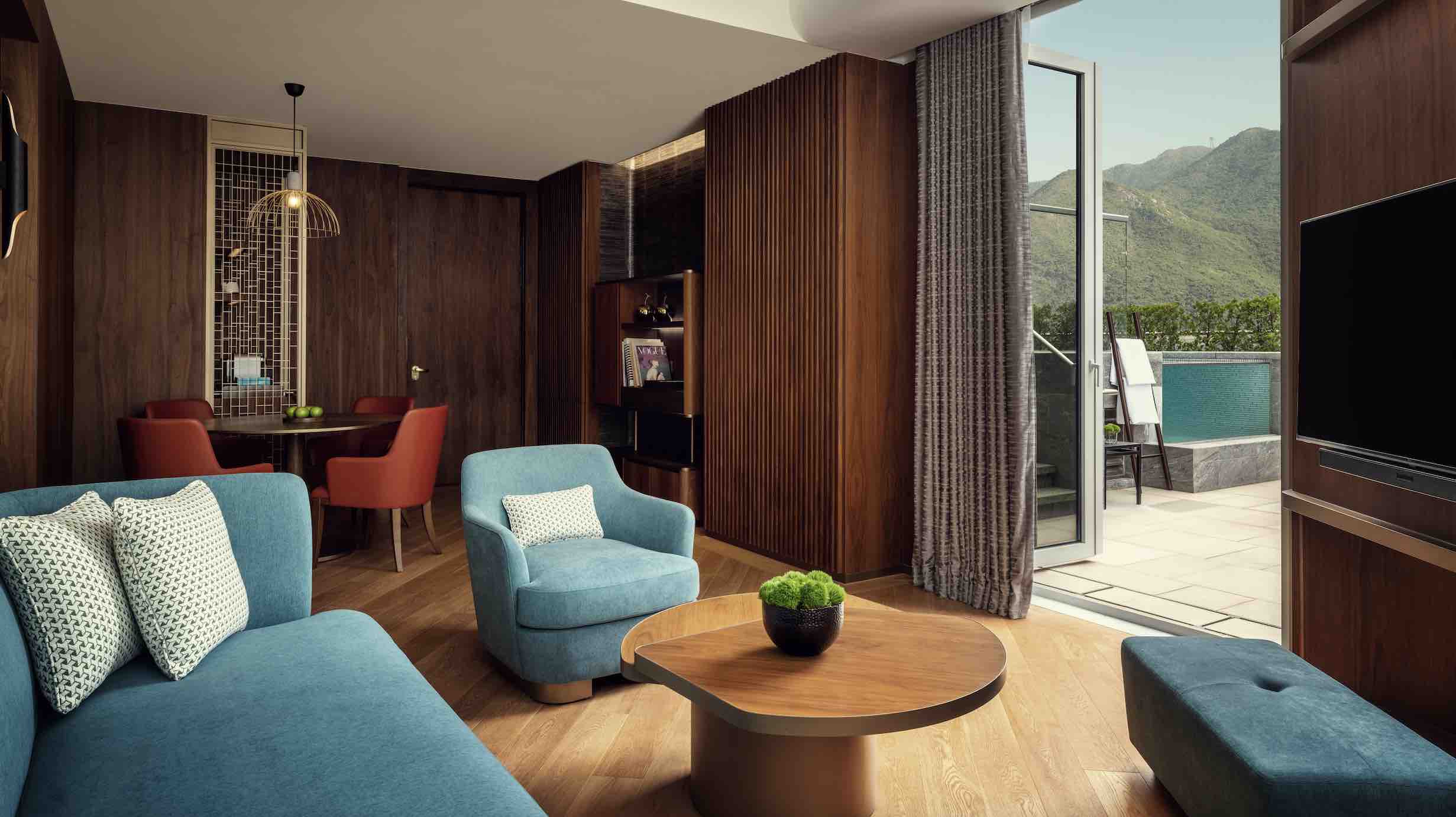 Within the hotel, guests will discover a lush, outdoor garden featuring winding paths, a stylish 25-meter swimming pool, expansive lawns, and a well-equipped fitness area. A dozen extraordinary signature suites surround the garden, featuring generously sized outdoor terraces, each with its own private outdoor Plunge Pool or private outdoor heated Jacuzzi overlooking the verdant hills of Lantau. These suites offer a true resort-style experience, rare among the urban environment of Hong Kong.