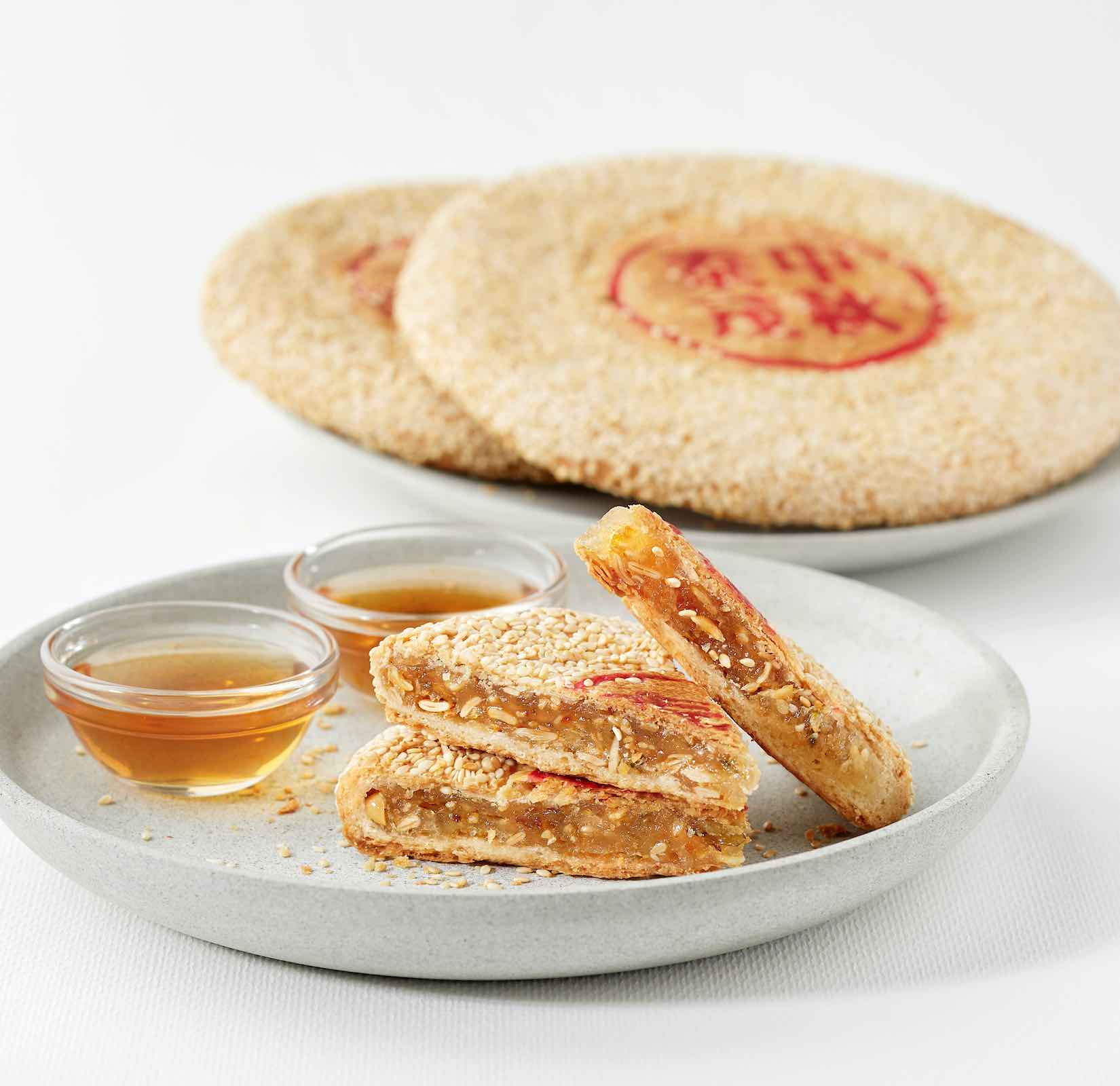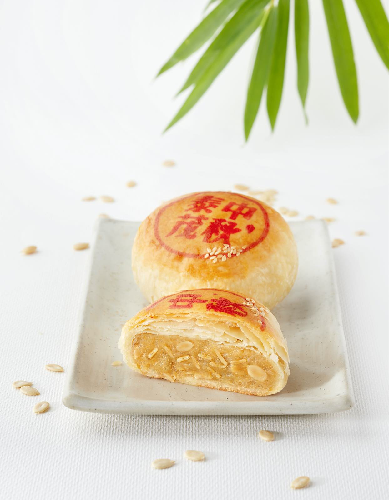o A large mooncake filled with a traditional Teochew recipe of maltose, white sesame - seeds, citrus strips and five-spice powder for a unique taste of yesteryear.