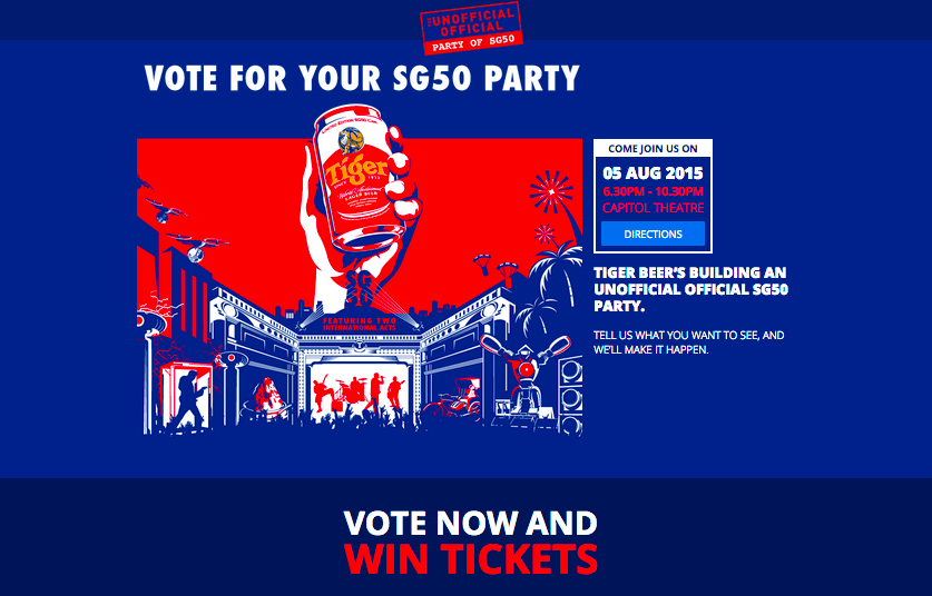 “We’re extremely excited to reward our longtime fans by galvanising the nation to vote for their ideal party situation in the Unofficial Official Party of SG50,” says Mr Rene de Monchy, Head of Marketing, Asia Pacific Breweries Singapore, “Tiger Beer is very proud of its Singapore roots and there’s no better way to celebrate the nation’s 50th birthday than by giving back to everyone, creating a party by the people, for the people – something that has never been done before.”