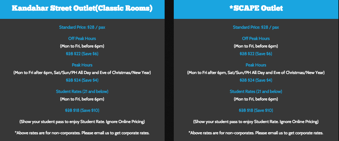 Each escape room game is priced between $15 to $24 per person. The price fluctuates based on traffic so it is advisable to go for it during off peak periods.
