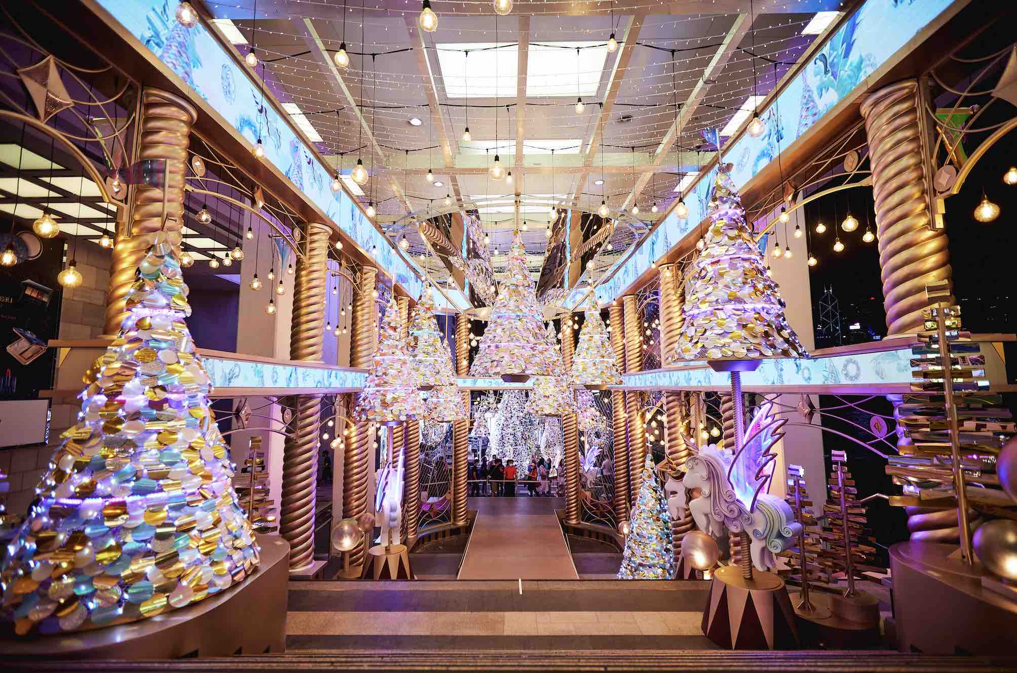 The biggest installation in this paradise Unicorn Merry-Go-Round Palace is located at Ocean Terminal Main Entrance Staircase. The palace consists of more than 10 Christmas trees hanging in the air and placed on both sides of the ladder of dreams with hundreds of sparkling stars under the ceiling. Everyone can indulge in the shimmering fantasy fairyland together with the unicorns.