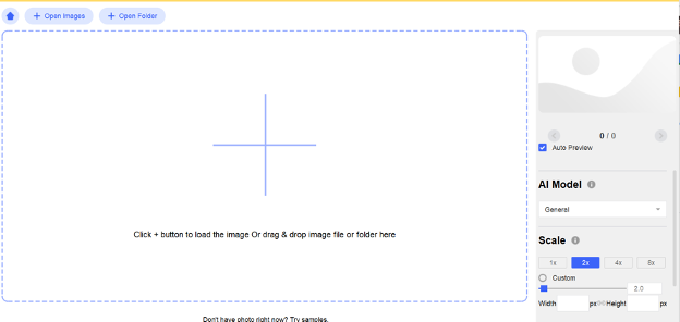 Step 2: Click on “Enlarge” and then upload the picture there by clicking on the “Plus” icon or dragging it to the center. On the right, choose the options about AI upscaling and then start the processing.