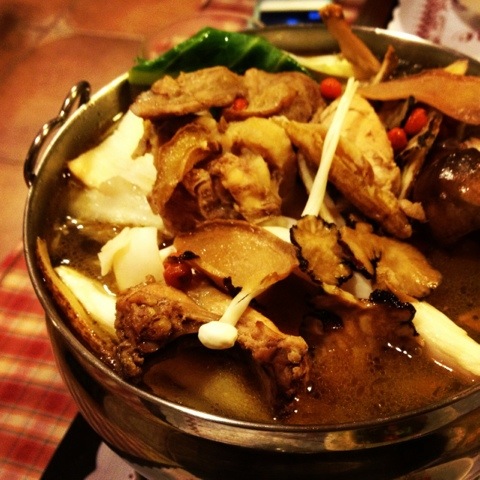 I ordered the 燒酒鸡 steamboat. Shao jiu 燒酒 literally means ‘liquor that burns’ in mandarin and they are worthy of their reputation with extremely high alcohol content of 50% or more. Having braved the snowy ice-caps on Hehuan Shan, the presence of liquor in this tasty soup base warmed my inside and also made my face go red! A number of Chinese herbs also went into the soup making this quite a ‘heaty’ steamboat but I knew what I was in for when I ordered it. The chicken was surprisingly tender, I always thought that kampong chicken meat was supposed to be tougher.
