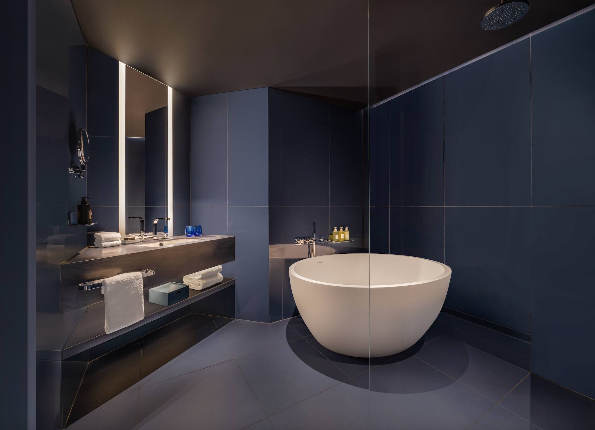 W Sydney’s 588 guestrooms, including 162 exceptional suites, draw inspiration from the hotel’s harbourside location and nearby beaches, exuding marine-chic in their nautical white and navy-blue palette and undulating walls that echo the sails of yachts in the marina below.