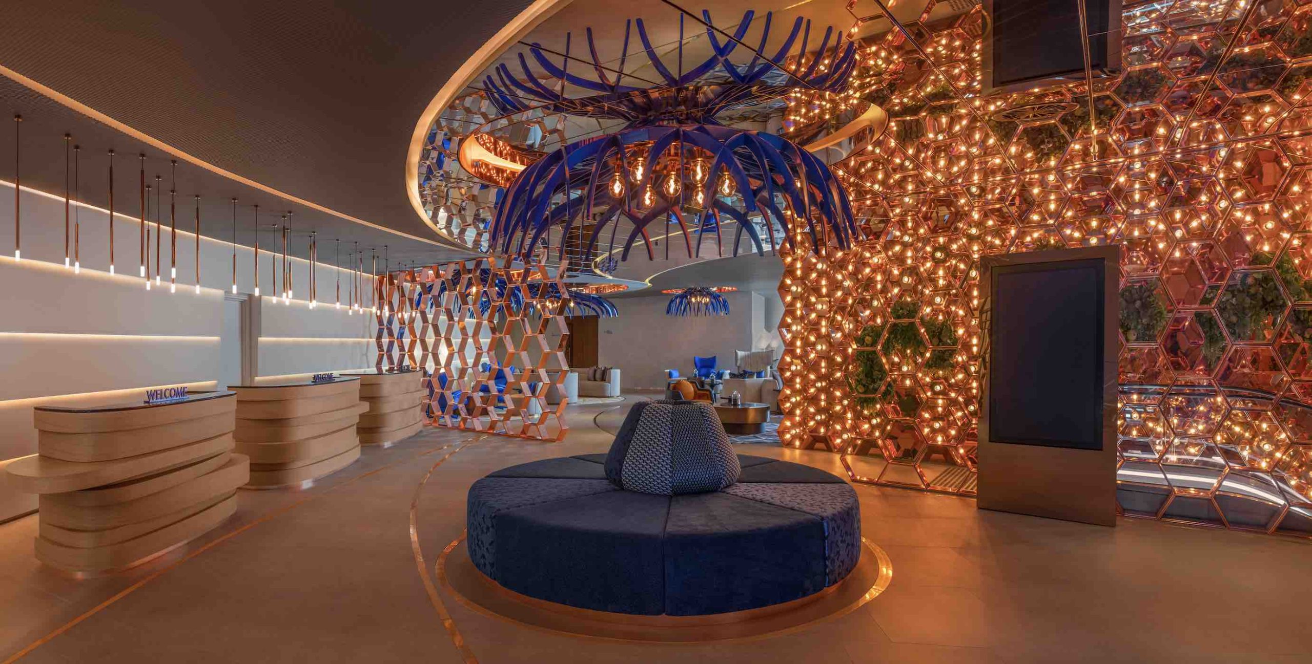 From the moment guests step past the W sign, inspired by the Australian Waratah flower, they are on a design-led journey. The copper-clad entry pays homage to subterranean Sydney and its disused railway tunnels, and an illuminated vertical promenade sweeps guests up into Living Room, a vivid blue space that reinvents the conventions of a traditional lobby by turning it into a social hub. Embracing a ‘Future Noir’ theme, Living Room is punctuated by an electric blue circular bar and nest-like seating that reference the Australian Bowerbird, a larrikin of the bird world.