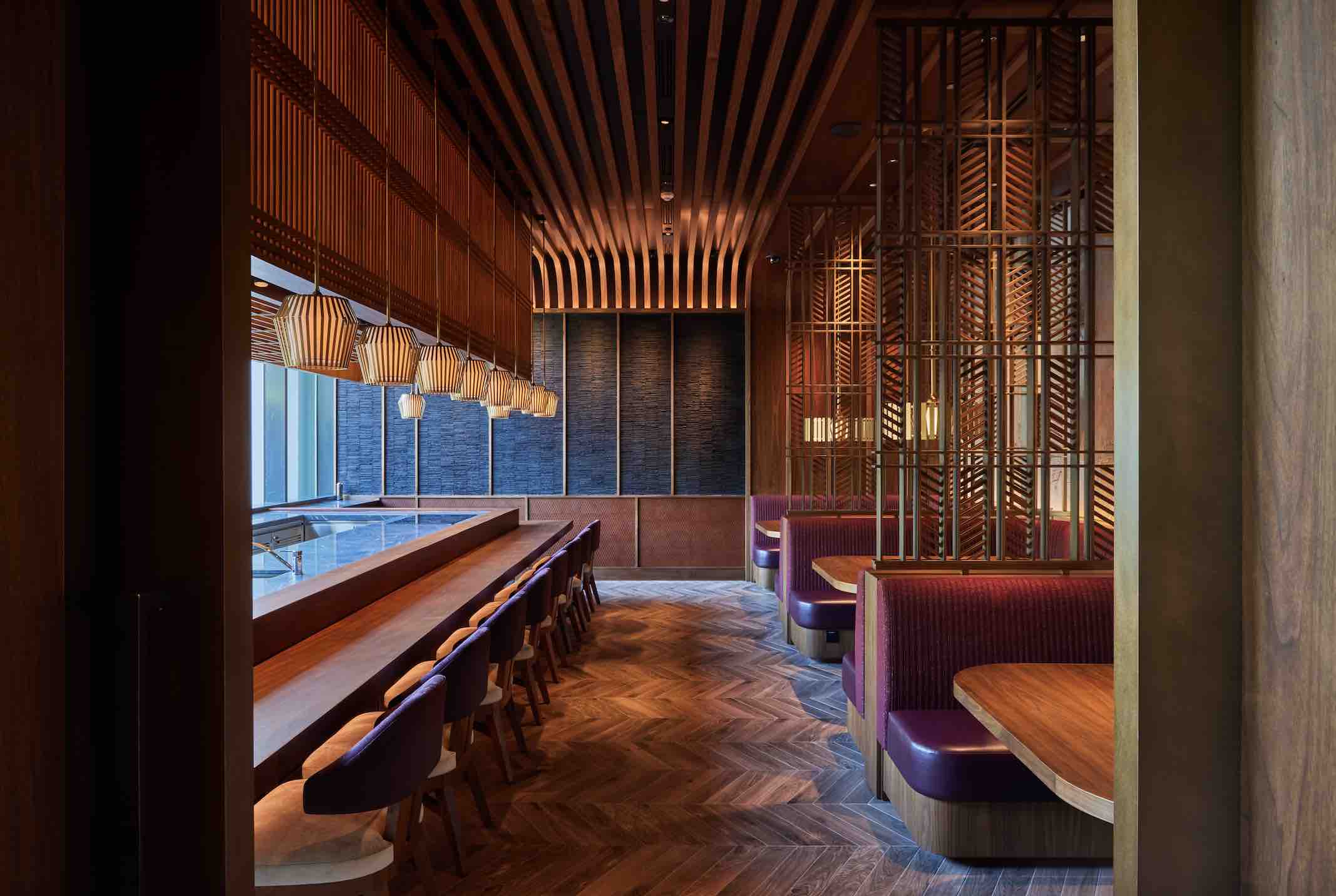 WAKUDA’s design was inspired by traditional Japanese architecture, celebrating the beauty of craftsmanship and nature, and infused with an element of urban Tokyo’s energy, modernity and spontaneity. Kumiki – a time-honoured wood joinery craft that traces back to the Asuka period (538-710 AD) – is used throughout. The restaurant’s entry features an up-lit Kumiki wood façade, juxtaposed against a massive split-faced natural stone wall. The artistry continues inside the restaurant, from a custom ceiling installation in the Main Dining Room and the suspended lighting fixtures of the Omakase Room to stylish banquette dividers adjacent to the Bar and the framed façade of the open kitchen.