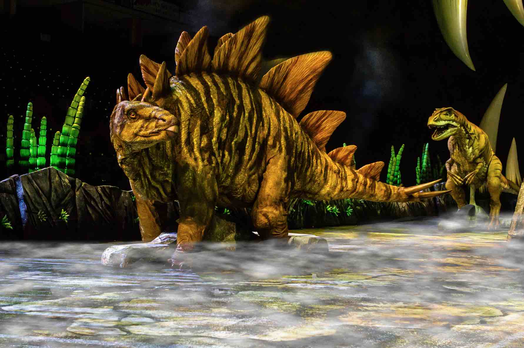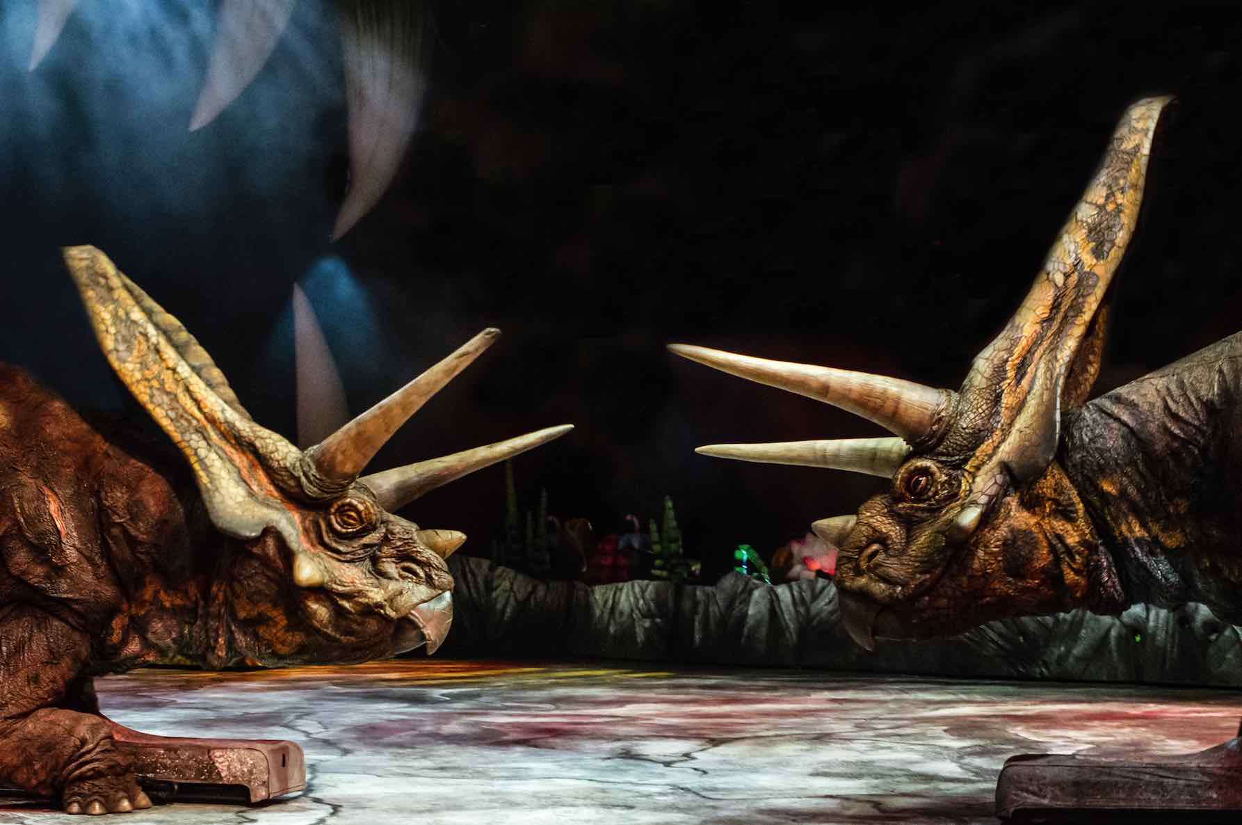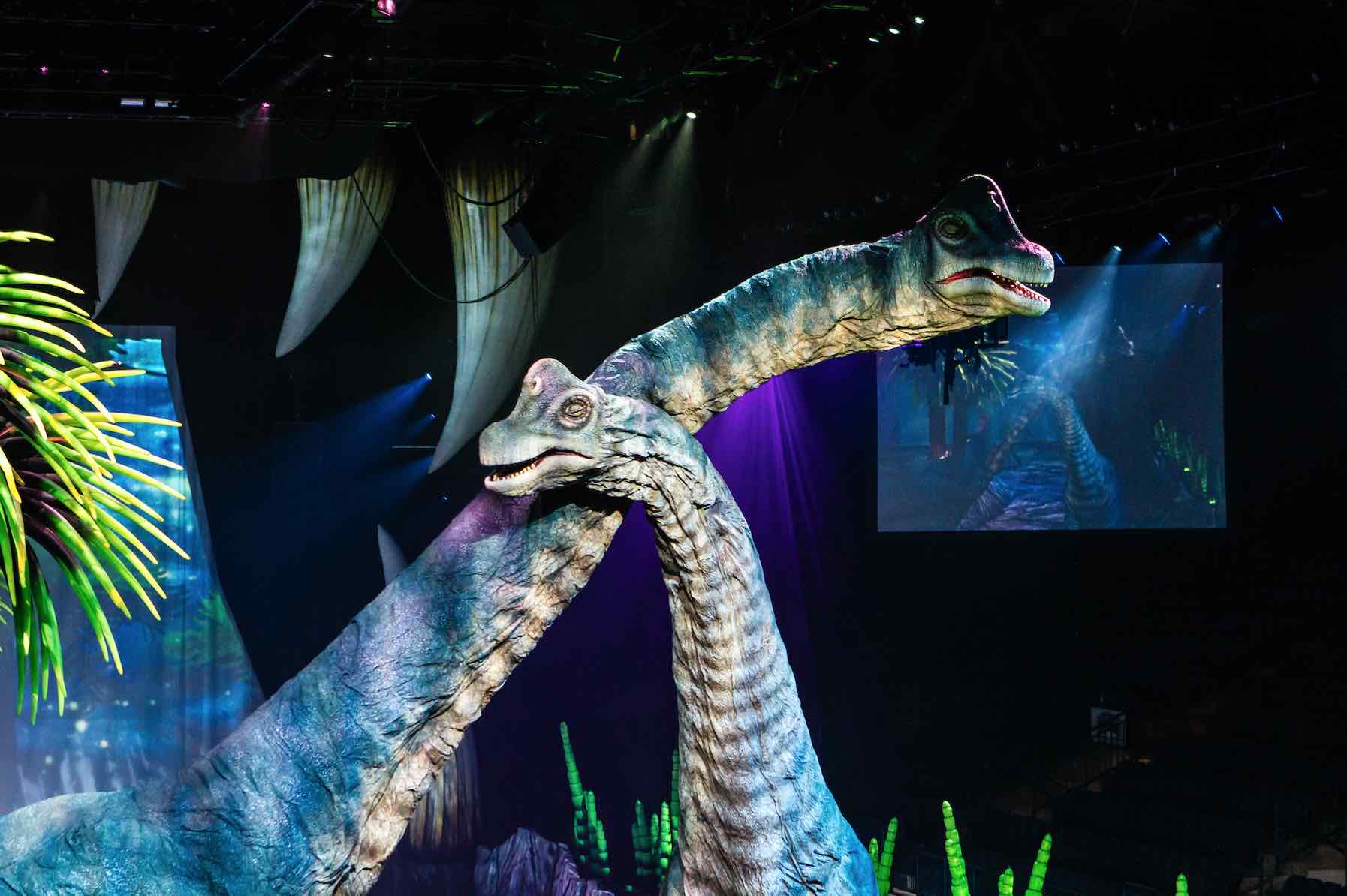 Nine species are represented from the entire 200-million-year reign of the dinosaurs. The show includes the Tyrannosaurus Rex, the terror of the ancient terrain, as well as the Plateosaurus and Liliensternus from the Triassic period, the Stegosaurus and Allosaurus from the Jurassic period and Torosaurus and Utahraptor from the Cretaceous period. The largest of them, the Brachiosaurus, is 11 meters tall and 17 meters from nose to tail. It took a team of 50 – including engineers, fabricators, skin makers, artists, painters and animatronic experts – a year to build the production.