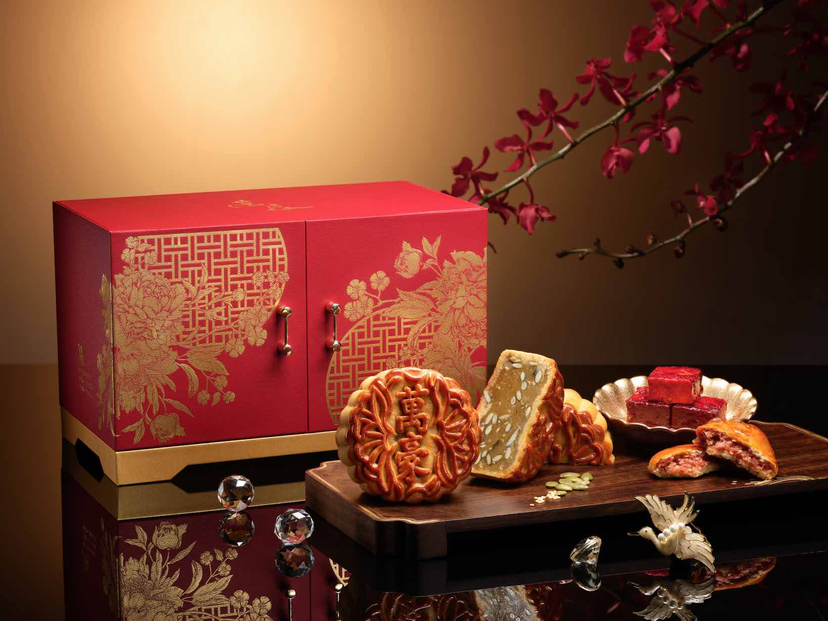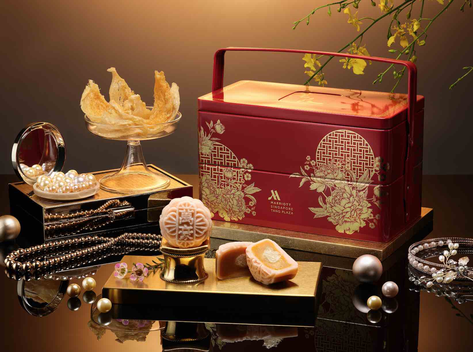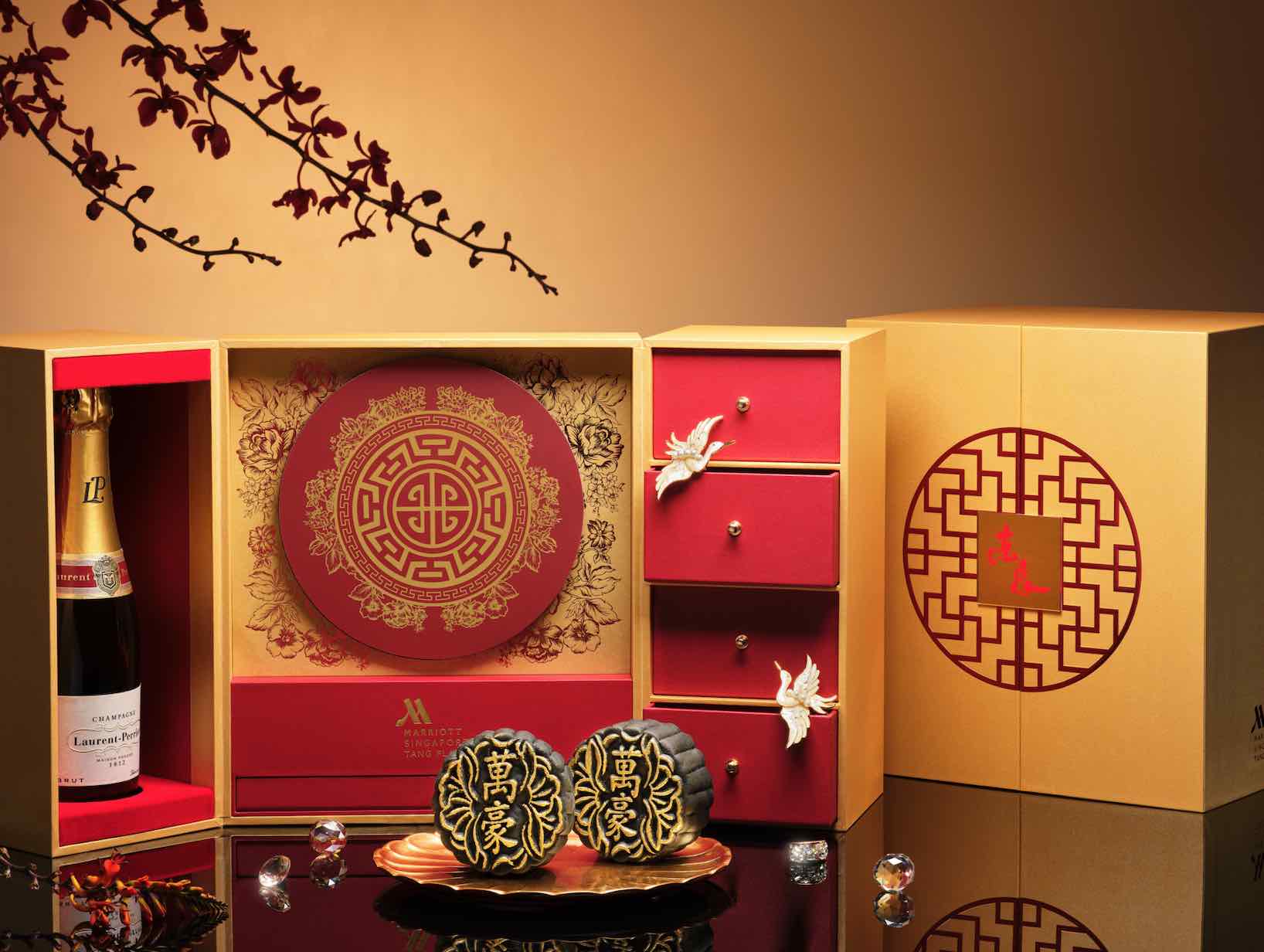 Singapore Marriott Tang Plaza Hotel’s elegant mooncake gift boxes are not only pictures of Oriental charm, our boxes are designed to convey well-wishes of happiness, prosperity and success to your loved ones. The Premium Gift Set and two-tier Red Treasure Box can be repurposed as a jewellery chest to house your trinkets long after its tasty treats have been enjoyed, while the Limited Edition Red Tinkat can be reused to store or ‘ta bao’ your favourite food.