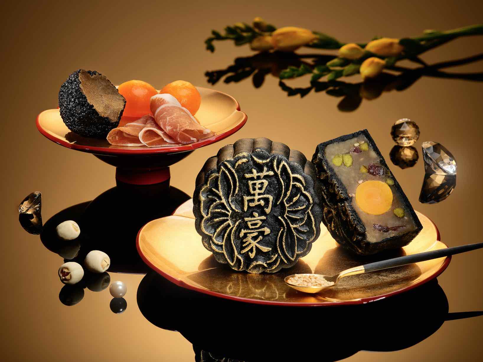 Looking for the ultimate ensemble to impress the most exquisite palate this Mid- Autumn Festival? Go over the top and set your eyes on four luxurious, gold-dusted Black Truffle Baked Mooncakes with San Daniele Ham, Single Yolk & Pistachios. An internationally haute ingredient and the “black diamond” in the culinary realm, the Black Truffle produces a unique earthy aroma; the sweet and aromatic San Daniele Ham that is revered as the King of Ham complements the sweetness of the silky