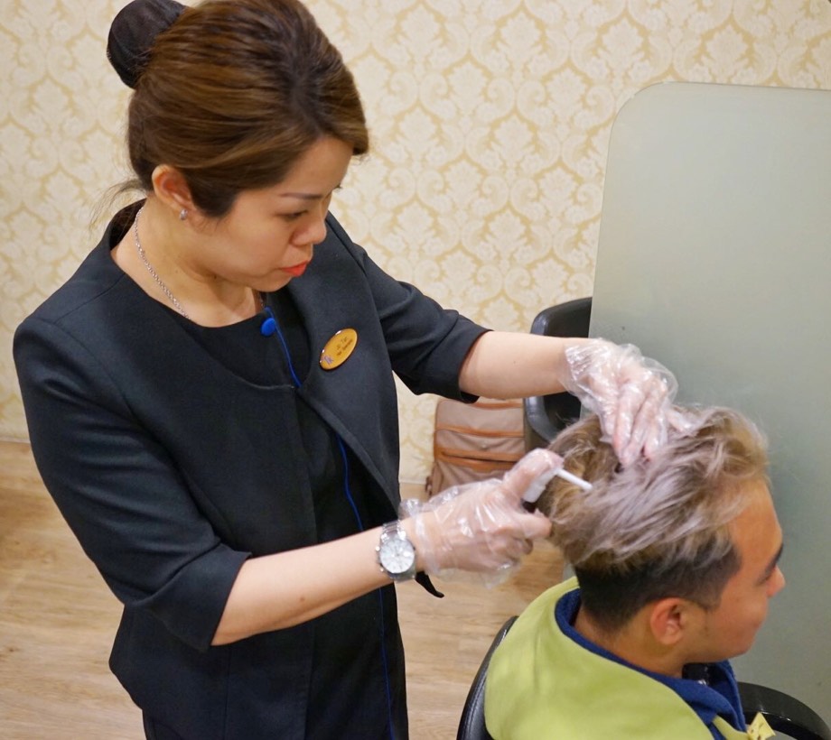 Next, a herbal hair tonic was applied to nourish his scalp and hair.