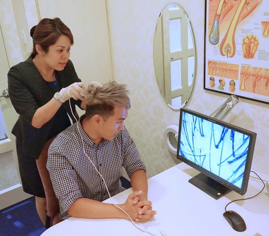 During the consultation, his Hair Specialist, Jo Tan invited him to share more about his lifestyle, diet and medical history. Because our hair and scalp can be affected by things we eat, our workout routine and hormonal balance, William’s answers will help Jo understand his existing condition and customise the most effective treatment for him.