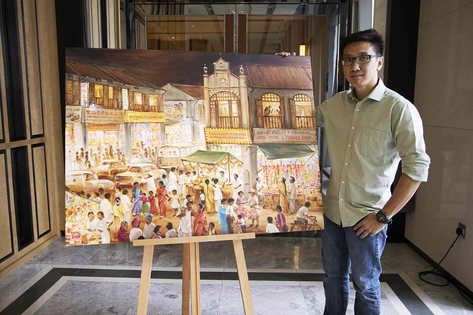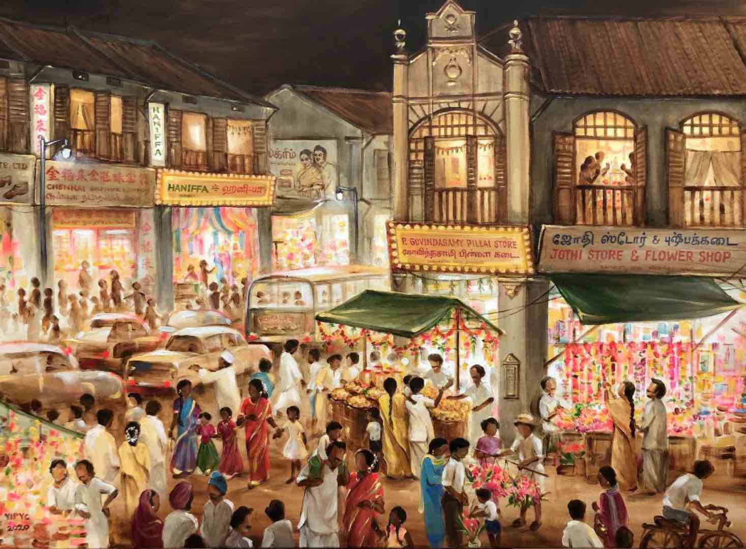 Painted between 2017 and 2021, the scenes in the paintings are panoramic yet intricate and provide a visual history of Singapore including major cultural festivals and traditions such as the Mid-Autumn Festival, Hari Raya Haji, Chingay procession and the Hungry Ghost Festival. Yew Chong grew up in Chinatown and now resides in Tanjong Pagar, so his intimate knowledge of the area’s legends and stories evokes a sense of travelling back through history.