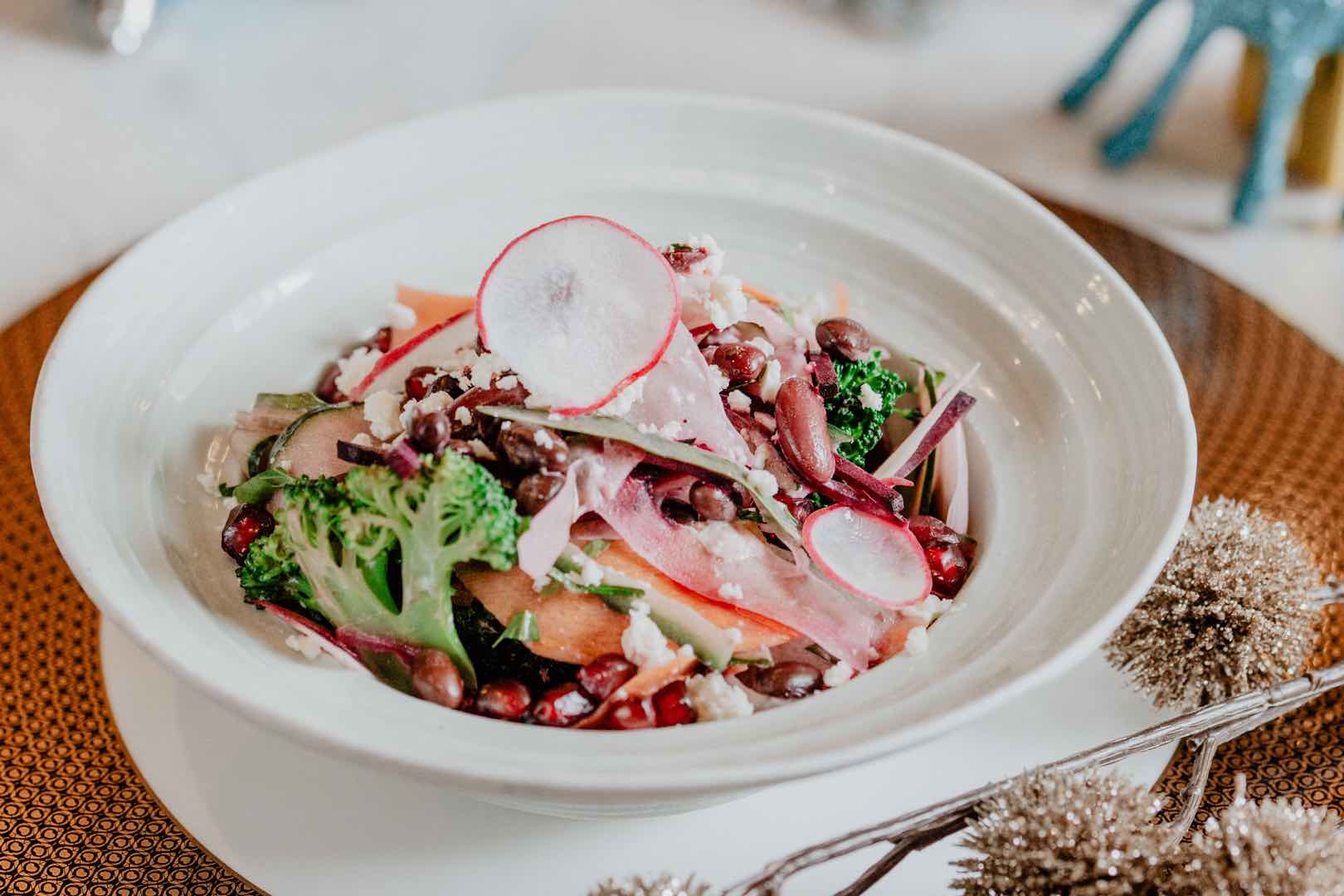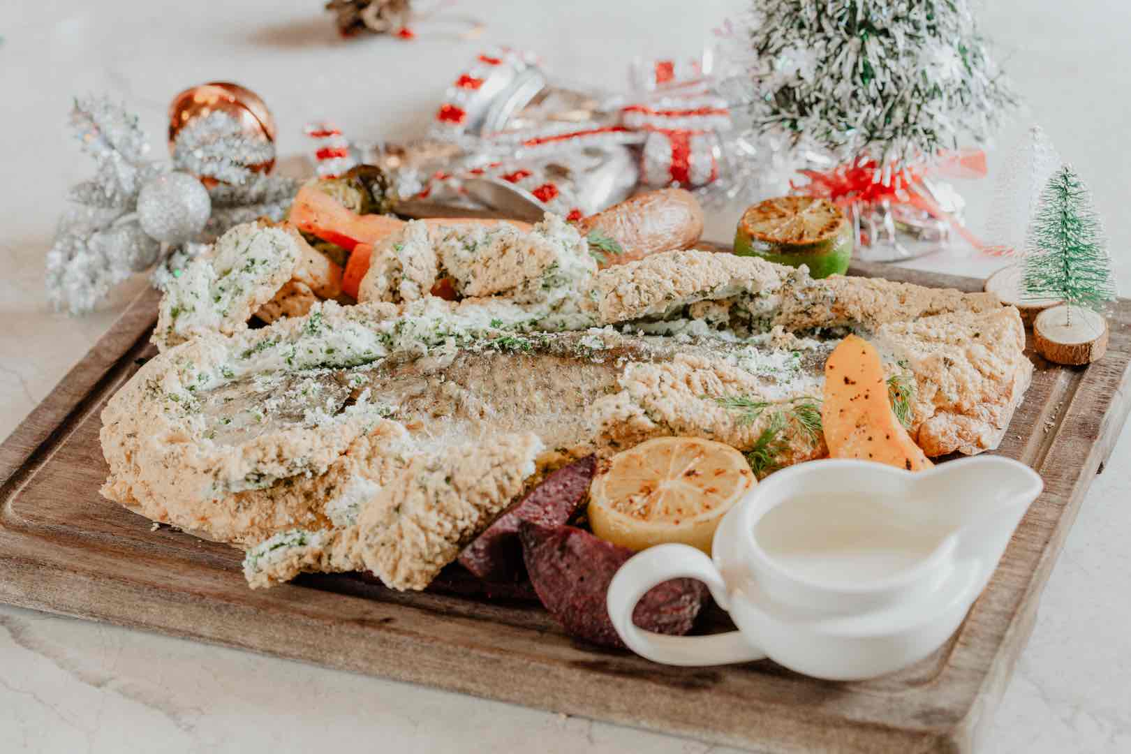 The Vegan Christmas Salad pulls all the stops with a cornucopia of winter vegetables such as beetroot, daikon, Japanese cucumber, and pomegranate. A red, green, and white themed Charcuterie board features a selection of gourmet ham, Parma ham, air-dried beef, mesclun salad, silver onion, gherkin, grapes, strawberries, dried apricots, dried cranberries, cheese, and crackers.