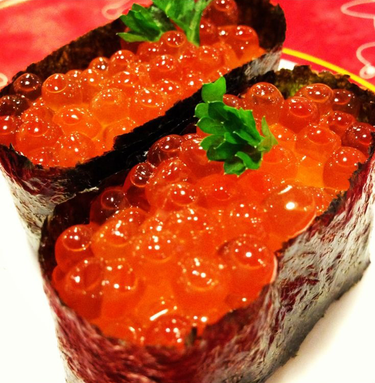 Sushi has traditionally been served on exquisite wood or lacquer plates on the sunny island of Singapore. A decade ago, local Japanese restaurants started to serve kaiten zushi or sushi train style. Colour coded plates of sushi are placed on a conveyor belt that went around customers’ seats for them to choose as they please. Sushi served came in a wide range of variety in terms of fillings, toppings, condiments and preparation. The single common ingredient for all sushi is the vinegared rice. Here is a lovely raw Salmon Roe Sushi dedicated to all fans of Japanese foods.